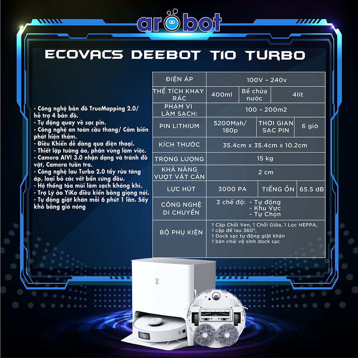 Bộ xử lý AI chuyên biệt mạnh hơn 16 lần và chứa sức mạnh tính toán AI nâng cao với khả năng nhận dạng đối tượng nhanh hơn, chính xác hơn và nhiều loại hơn để cho phép dễ dàng tránh chướng ngại vật và ít bị rối hoặc kẹt hơn. AIVI 3.0 có tính năng nhận dạng thông minh có thể tự động xác định 18 * khác nhau các loại đồ vật trong nhà, chẳng hạn như đồ nội thất, vật liệu nền và các đồ vật khác. * Dữ liệu đến từ phòng thí nghiệm ECOVACS. DEEBOT T10 được trang bị công nghệ AIVI 3.0 và máy ảnh RGB cấp độ chụp ảnh thiên văn, có thể nhận dạng con người và các loại vật thể khác nhau, bao gồm: tất, giẻ lau, giày, dây cáp, ghế hình chữ U, đế sạc, thùng rác, thảm trải sàn, giường , ghế sofa, bàn cà phê, ghế đẩu, cửa ra vào, tủ TV, bàn ghế ăn, vật nuôi và vật liệu lát sàn. Danh sách các đối tượng nhận dạng sẽ tiếp tục được cập nhật. Hiệu suất thực tế của sản phẩm phụ thuộc vào môi trường và hình dạng của các đối tượng.
