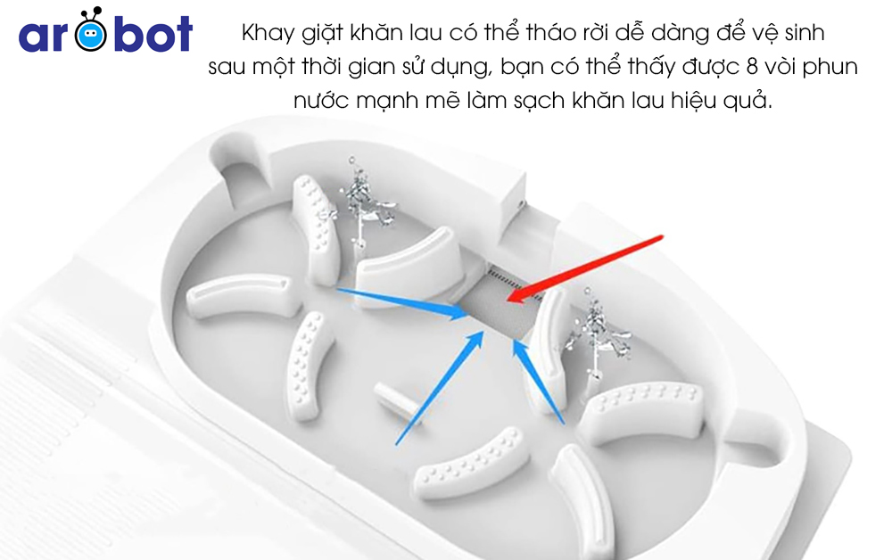 Khay rửa bên trong bệ Dock sạc của W10 dễ dàng được tháo ra để vệ sinh và làm sạch một cách nhanh chóng. Hệ thống 8 lỗ phun nước được thiết kế trên bề mặt hình hoa văn giúp làm sạch vải lau tốt hơn, sau khi làm sạch vải lau cũng có thể ráo nước còn sót lại trên khăn lau. Điều này làm giảm độ ẩm của khăn lau và tránh gây mùi hôi khó chịu.