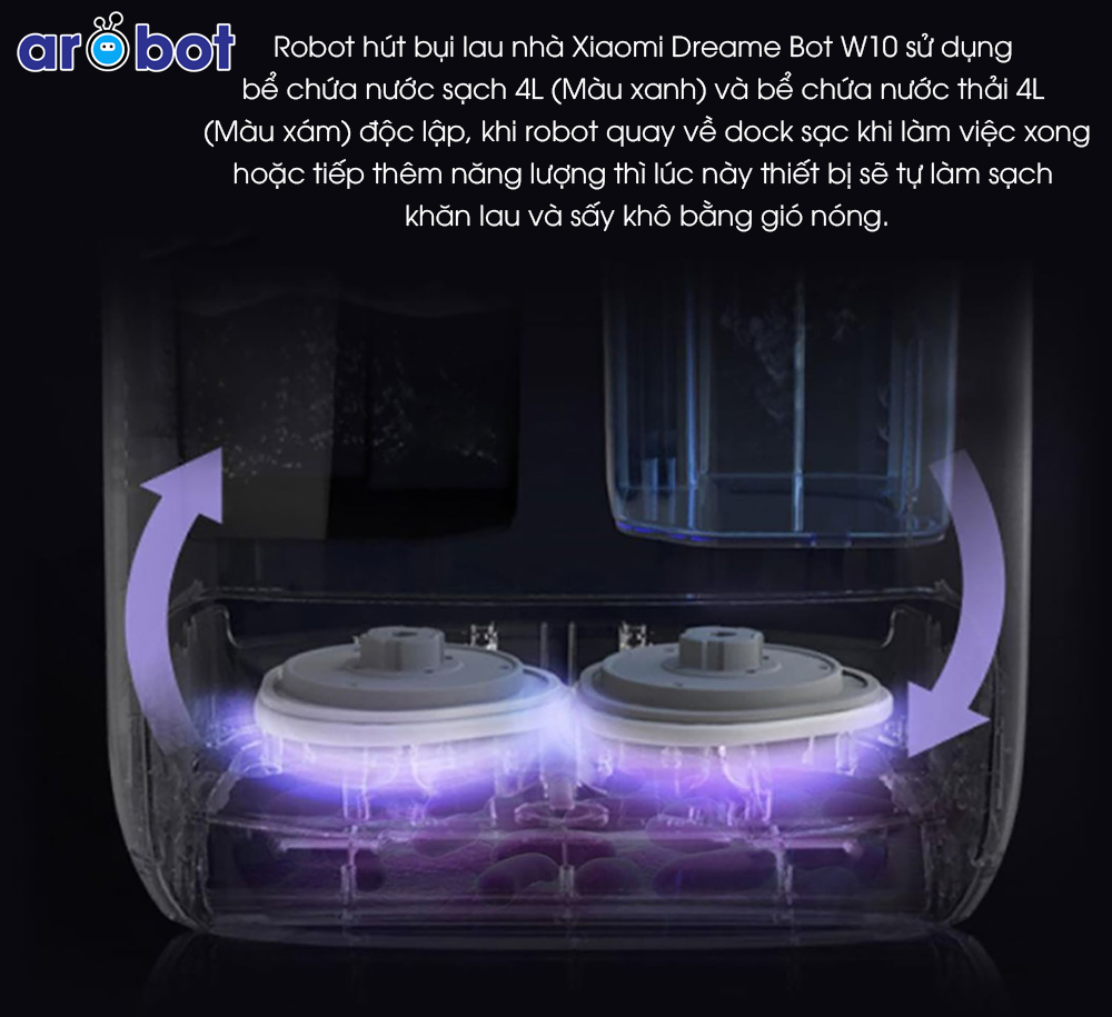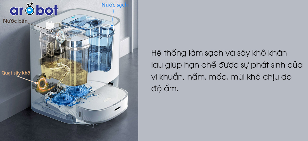 Sau khi hoàn thành công việc dọn dẹp nhà cửa, Robot Dreame W10 tự động trở về Dock sạc để làm sạch vải lau và tự động bật sấy khô. Vải lau khô có thể tránh được sự phát triển của vi khuẩn, nấm mốc tốt hơn và ngăn chặn mùi hôi khó chịu, điều này không chỉ hiệu quả làm sạch mà còn tăng được bầu không khí trong lành.