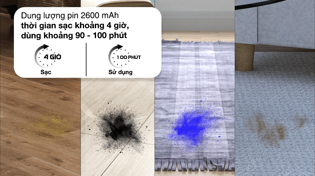 Mỗi khi sạc đầy pin bạn cần mất khoảng 4 tiếng. Trường hợp đang hoạt động mà dung lượng pin thấp thiết bị sẽ bị động quay về dock sạc để sạc thêm năng lượng. Đến khi sạc xong nó sẽ hoạt động trở lại và hoàn thành phần việc còn lại.